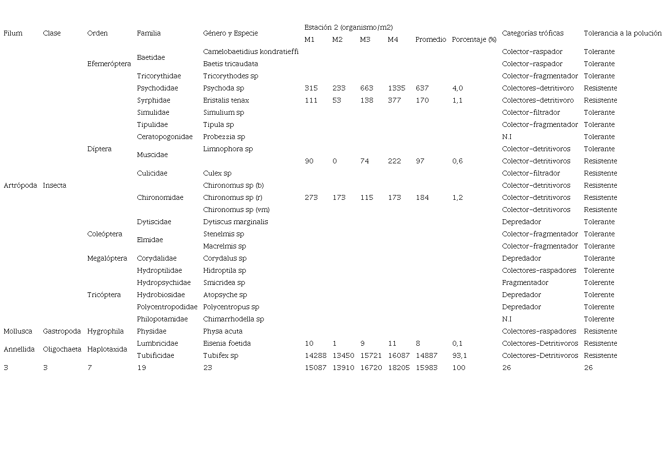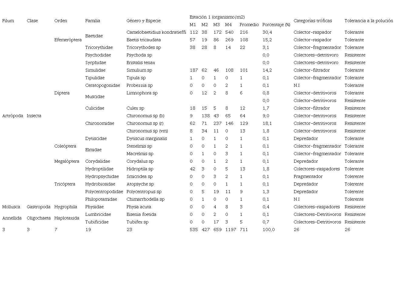 Los cuadros 1 y 2 muestran las órdenes de macroinvertebrados encontrados en los distintos puntos muestreados en ambas estaciones; la estación 1, posee indicadores de aguas moderadamente contaminadas y bien oxigenadas [5], [13], siendo las más representativas, Díptera, Ephemeroptera y Tricoptera, pertenecientes a la clase insecta; los géneros más representativos de los macroinvertebrados bentónicos en esta estación, fueron: Camelobaetidius 30,4 %, Chironomus sp con un 28,9 %, Baetis 15,2 % y Simulium 14,2 %. Camelobaetidius, Baetis y Simulium sp, mientras que en los puntos muestreados de la estación 2, se registraron indicadores de aguas fuertemente contaminadas, con alta polución orgánica, siendo la más representativa, la presencia del orden díptera de la familia Chiromomidae; los géneros que destacan fueron: Tubifex sp con un 93 %, Psichoda sp 4 % y Chironomus sp 1 %, esto demuestra que zonas cercanas a poblaciones están siendo impactadas por la actividad humana a diferencia de las zonas altas que tienen menor contaminación [8].