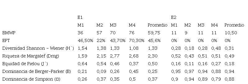 A partir de los estudios realizados, se obtuvieron los valores del cuadro 3, donde se evalúa la calidad de agua; el indicador de % EPT en la estación 1 y 2, presenta un promedio de 45,6 % y 0 %, la presencia de estos individuos de los grupos Ephemeroptera y Tricoptera son indicadores de bajos impacto antrópico [7], [16], tal como se observa en la primera estación, mientras que, porcentajes menores, denotan elevada contaminación, propio de la segunda estación. El índice de diversidad (H) tuvo un promedio de 1,33 y 0,31respectivamente en ambas estaciones, es decir este índice es bajo [8], en cambio el índice de diversidad de Shannon-Wiener se encuentra en término medio con un valor de 1,33 y 0. La riqueza de Margalef promedio en la estación 1, fue de 2,30 determinándose que es una zona de mediana diversidad y la estación 2, fue de 0,50 determinándose zona de baja diversidad; en cuanto a la Dominancia de Berger-Parker y Simpson sólo en la estación 2 se presentaron taxones dominantes (valores mayores que 0,55) con un promedio de 0,94 a 0,88, indicador de alta contaminación del agua. En la estación 1, no hubo presencia de estos taxones obteniéndose un promedio de 0,25 a 0,37