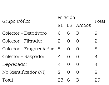 En total se colectaron 26 géneros de macroinvertebrados bentónicos (cuadro 4), para un sector del río Chotano entre los meses de agosto a octubre; 23 géneros corresponden a la estación 1 y 6 géneros corresponden a la estación 2, de los cuales 3 géneros estuvieron presentes en ambas estaciones que son colector- detritívoro. En la estación 1, lo más representativos fueron 6 géneros con grupo trófico colectores – detritívoros, seguido con 5 géneros con grupo trófico colector-fragmentador, 4 géneros son colector-raspador y depredador y 2 géneros son colector-filtrador y 2 géneros no identificado; en la estación 2 se colectaron 6 géneros con grupo trófico colector-detritívoros.