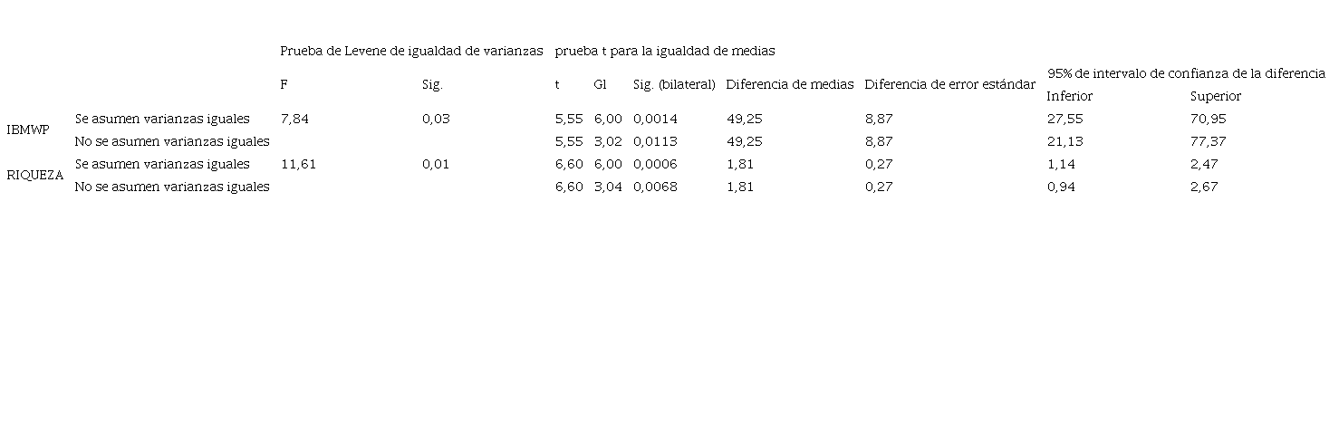El estadístico de Levene y la prueba t, para el índice IBMWP y la riqueza, aplicadas para evaluar la igualdad de varianzas (cuadro 5), evidencian que existen diferencias significativas entre la variabilidad de ambas estaciones en estudio (p ≤ 0,05).