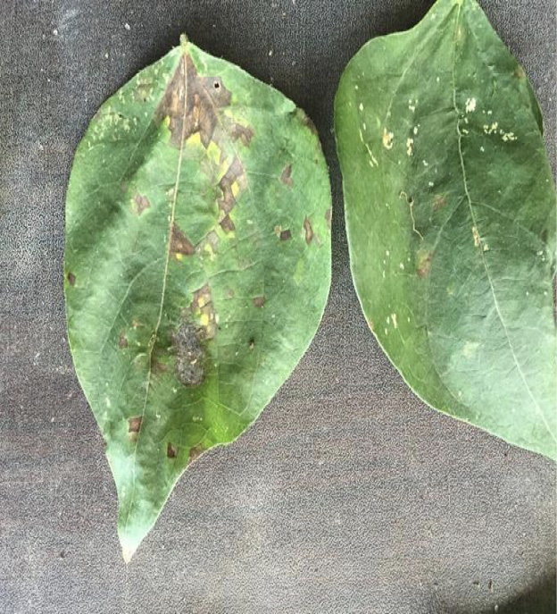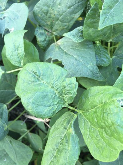 Figura 2. Hojas de frijol común con síntoma de necrosis foliar. Estación Experimental Agrícola Fabio Baudrit, Alauela Costa Rica. 2015.