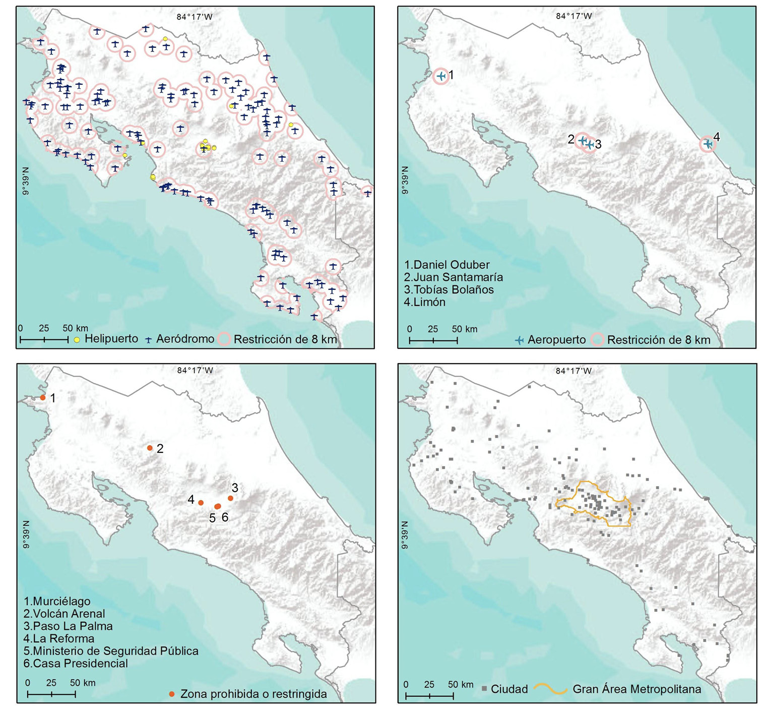 Figura 1. Distribución de aeródromos, helipuertos, aeropuertos, anillo de restricción de 8 km, zonas prohibidas, restringidas y ciudades de Costa Rica