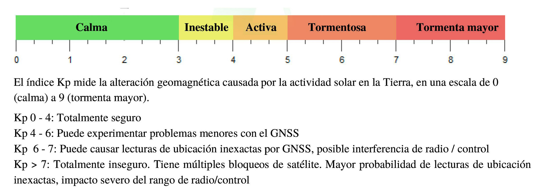 La actividad solar genera tormentas que impactan el campo magnético Terrestre. Este fenómeno puede durar horas o días. La NOAA [9] ha definido una escala para cuantificar la intensidad y los efectos a nivel local. En la aeronáutica pueden derivar riesgos en el uso de las telecomunicaciones por la interferencia que puede causar este tipo de ondas. En el caso de los RPAS, las tormentas solares pueden alterar los sistemas globales de navegación satelital (GPS, GLONASS, GALILEO, otros) en inglés (GNSS), la brújula, la telemetría, entre otros sensores a bordo). La escala del índice Kp se muestra explicada en la figura 3.