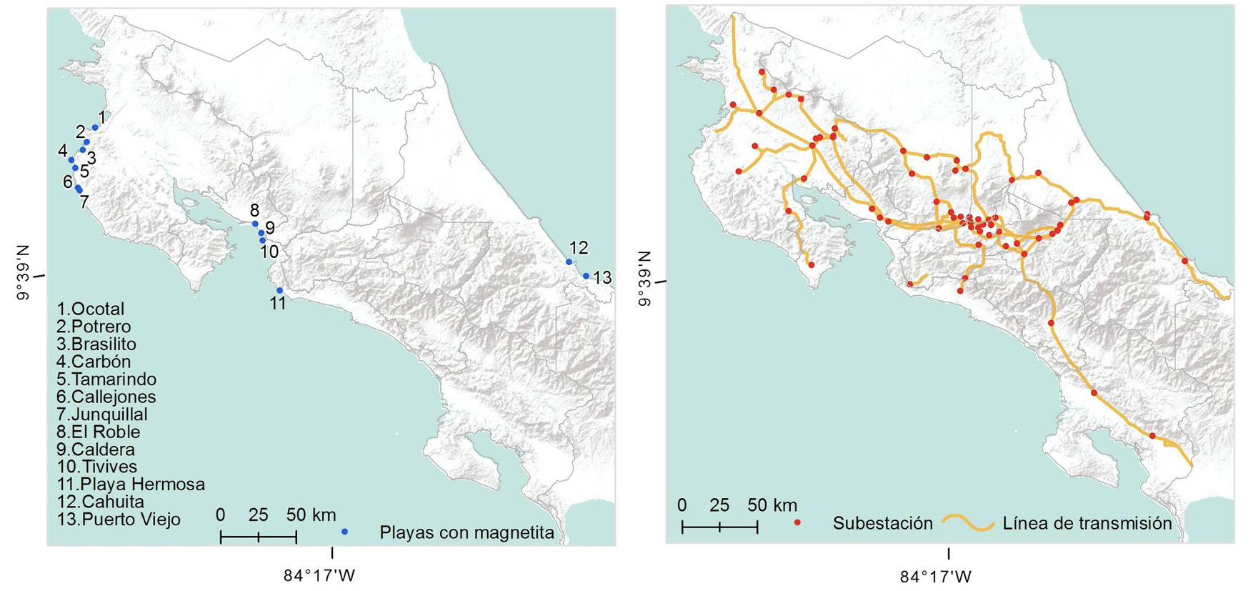 Figura 4. Playas con arena de magnetita y distribución de la línea de transmisión eléctrica en Costa Rica.