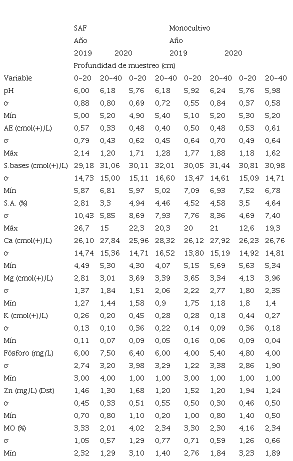 Para evaluar la fertilidad fisicoquímica del suelo, fueron consideradas variables que definen la acidez tales como pH, suma de bases, acidez extraíble y saturación de acidez; además de macro y microelementos, también la materia orgánica y la relación C/N. Por otro lado, se determinaron la densidad aparente (Dap) y la de partículas o real (Dr), con las cuales se obtuvo la porosidad. Se tomaron muestras a dos profundidades 0 - 20 cm y 20 - 40 cm debido a que alrededor del 80 % de las raíces de las especies de plantas dentro de este sistema agroforestal no superan esta profundidad, se hicieron análisis químicos a través de las soluciones extractoras KCl-Olsen Modificado y el porcentaje de carbono y nitrógeno totales a través del método Autoanalizador Dumas. La acidez fue determinada por valoración con NaOH y el Al con HCl; el P y S por colorimetría con el Analizador de Inyección de Flujo (FIA) y los demás elementos como el potasio, calcio, magnesio y zinc por Espectrofotometría de Absorción Atómica.