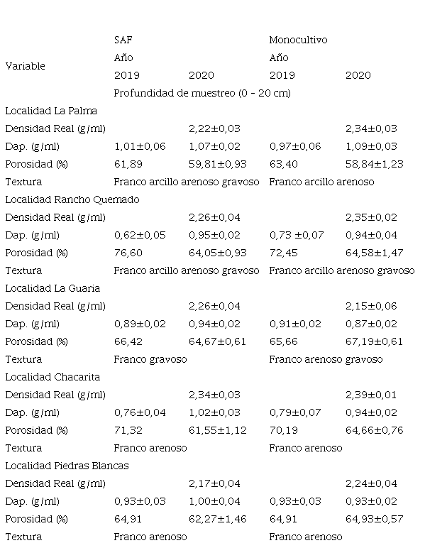 Los valores de la densidad aparente (Dap) y la porosidad de los suelos en dos años (2019 y 2020), y la densidad de partículas (real) en el año 2020, a la profundidad de 0 a 20 cm, relacionadas con las cinco localidades del proyecto LAPA, se muestran en el cuadro 2.