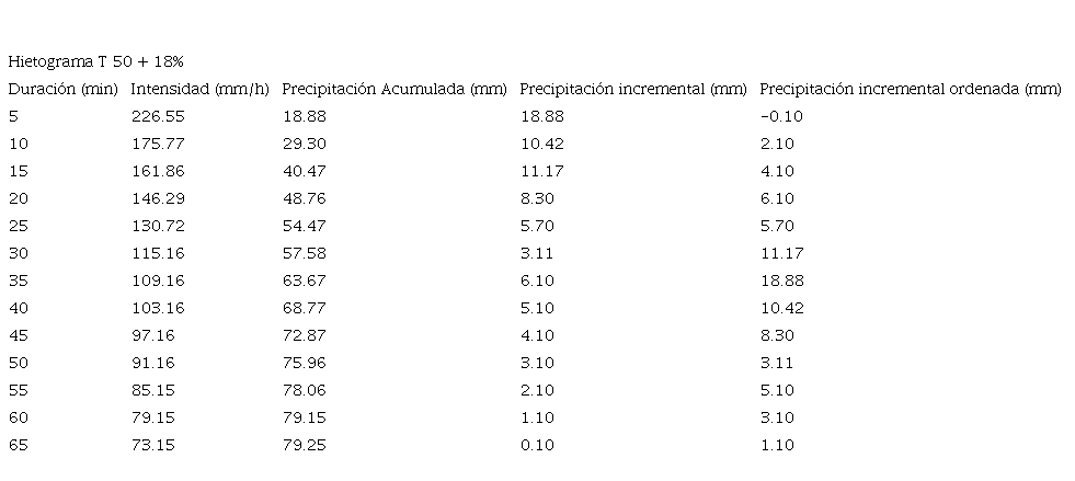 Con la intensidad de lluvia del cuadro 1 se generó un hidrograma (ver figura 1) con periodo de retorno de 50 años y dentro del mismo una comparación con un incremento del 18% en la intensidad de lluvia debido al cambio climático [6].
