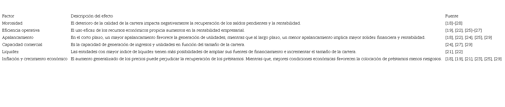 En el cuadro 1 se presenta un listado de factores que afectan la rentabilidad de una entidad financiera, dando especial énfasis a la morosidad crediticia.