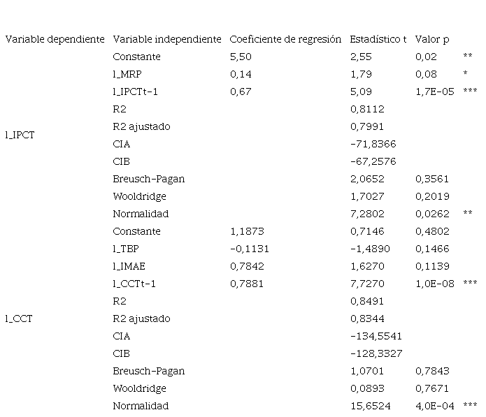 La modelación econométrica respalda la relación expuesta y demuestran la elasticidad entre MRP e IPCT (cuadro 2). Los resultados indican que, por el aumento del 1% en la MRP, los IPCT incrementan 0,14%, aunado al componente autorregresivo de un periodo.