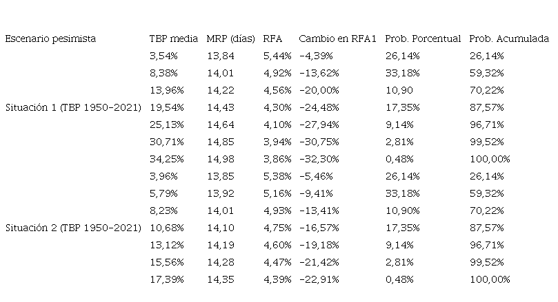 Los resultados del análisis de sensibilización muestran reducciones en la rentabilidad según el RFA, en concordancia con los aumentos en la morosidad (cuadro 3). En la primera situación macroeconómica planteada existe una probabilidad de ocurrencia del 26% de que la TBP presente su nivel medio más bajo, lo que propicia una reducción a 4,39% en el RFA con respecto al escenario estable.
