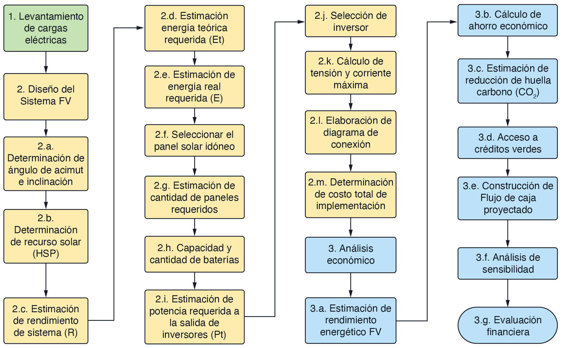 En la presente sección se muestra el desarrollo de la metodología para análisis de cargas, diseño, selección de equipos, posterior cálculo de rendimiento energético y análisis económico de un sistema fotovoltaico para una pequeña empresa [24]. El paso a paso se muestra en la figura 1 y se explica a continuación [25]: