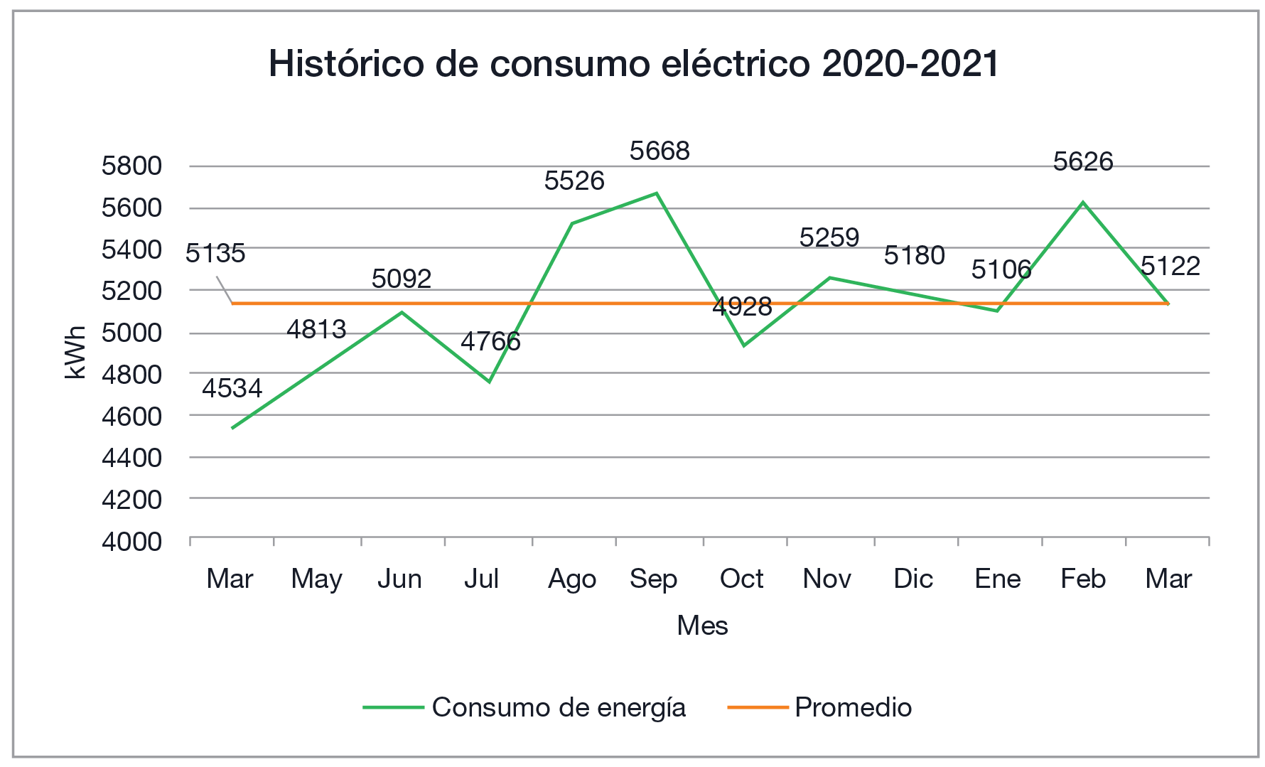 En la figura 3 se muestra el comportamiento de consumo eléctrico de la planta, basado en un historial de los últimos 12 meses en el momento de la aplicación de la metodología, de los cuales se tiene un valor promedio de 5135 kWh mensuales.