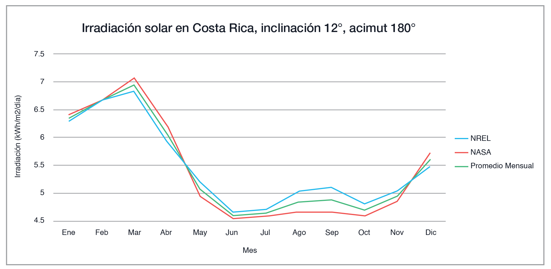 Figura 4. Irradiación solar en Costa Rica para una inclinación 12°y un ángulo acimut 180° basado en [27], [28].