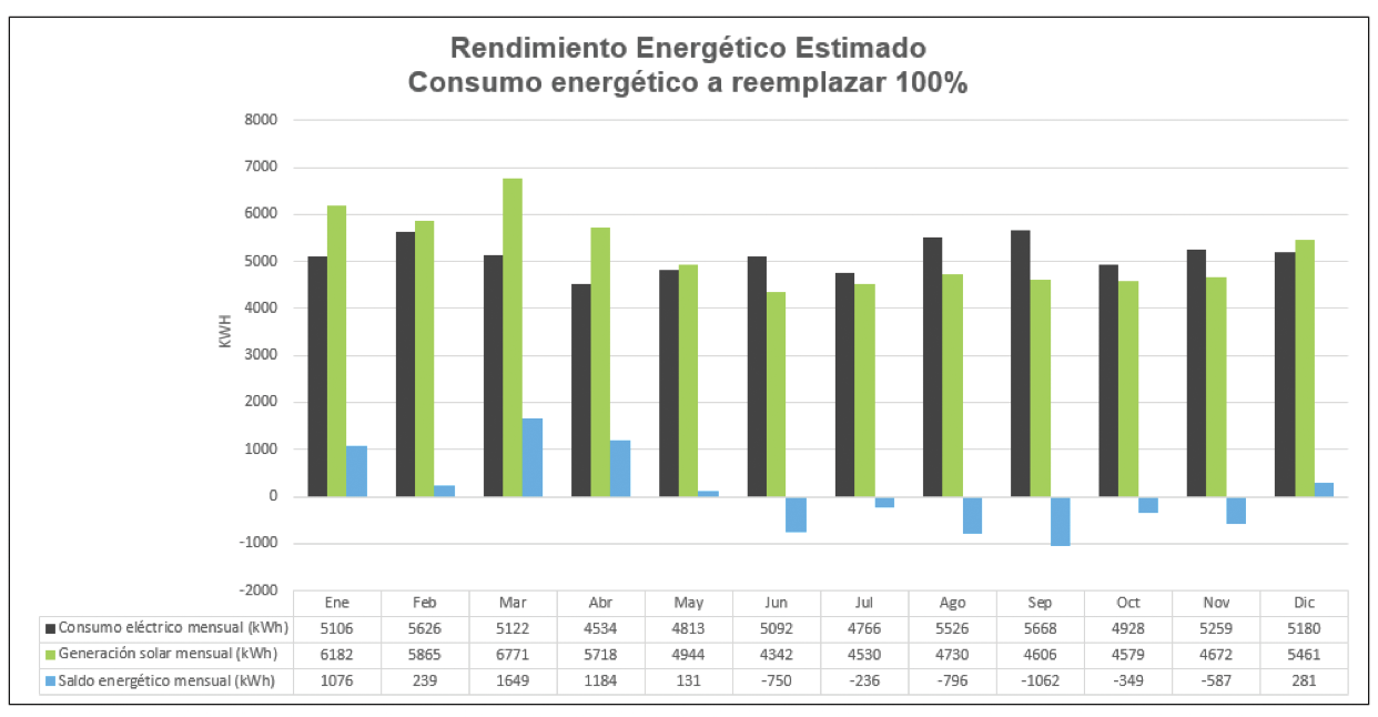 En la figura 6 se muestra la producción energética esperada vs el consumo actual. Se observa un mínimo de generación en junio de 4342 kWh y un máximo de 6771 kWh en marzo. Representaría un ahorro anual de CO2 equivalente de 3.43 toneladas.
