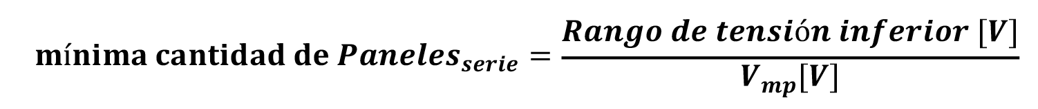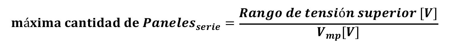 Con respecto a la corriente máxima, se tiene que su valor máximo se calcula mediante la suma de las corrientes nominales de cortocircuito (ISC) de los módulos fotovoltaicos conectados en paralelo, y multiplicado por el 125%. Para el caso del valor nominal (Inom) de los dispositivos contra sobre-corrientes, se calculará mediante la multiplicación de la corriente máxima por el 125%. Seguidamente, se calcula mediante la ecuación 8 y 9 la cantidad mínima y máxima de paneles a conectar, para que el inversor opere de manera óptima. Donde Vmp es la tensión a máxima potencia del panel.