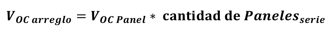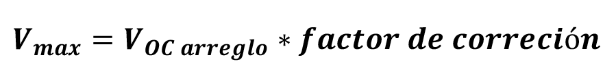 La tensión máxima de un sistema fotovoltaico en la salida de corriente directa se calculó mediante la suma de la tensión de circuito abierto (VOC) de los módulos fotovoltaicos conectados en serie, multiplicada por un factor de corrección según la temperatura ambiente más baja esperada. Este valor se calculó con el objetivo de determinar la tensión nominal de los cables, desconectadores, dispositivos de protección contra sobre corriente y otros equipos, así como los factores de corrección por temperatura en conductores entre otros [30].
