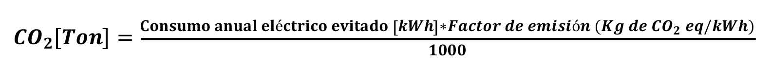 Se calcula el CO2 equivalente evitado en toneladas al año. Este último se calcula mediante la ecuación 12. Donde el factor se obtiene de [31].