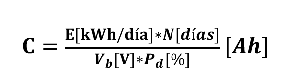 •Pd: profundidad de descarga ≤ 100%. Se elige 100% puesto que el sistema no tiene pérdidas por almacenamiento de energía.