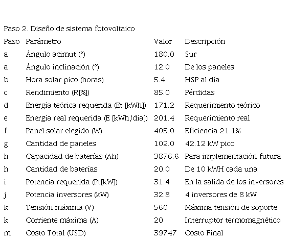 La empresa cuenta con un área de 500 metros cuadrados de construcción, y una tensión monofásica de alimentación en 120/240 VAC. Asimismo, con un área de 370 m2 de área efectiva disponible para la instalación de paneles solares. El sistema fotovoltaico estimado requerirá 200 mts (102 paneles) de área efectiva, para un potencial total de 42.12 kW, mediante paneles fotovoltaicos de 405W cada uno. Se seleccionaron 4 inversores de 8200 W de potencia cada uno.