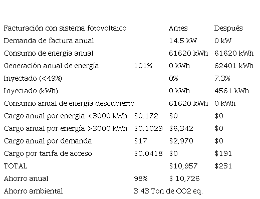 Se procedió a simular la implementación del sistema propuesto mediante el programa de generación distribuida para autoconsumo con medición neta sencilla disponible en el país, con el objeto de estimar el ahorro anual tal y como se muestra en el cuadro 2. La implementación del proyecto sin financiamiento lograría un ahorro mensual en la factura eléctrica de 825 USD con una recuperación de la inversión en 9 años. En el caso de recurrir a financiamiento, se obtendrían ahorros mensuales de ٤٢٨ USD con una recuperación de la inversión en 5 años. Se espera que la vida útil del proyecto sea de ٢٥ años.