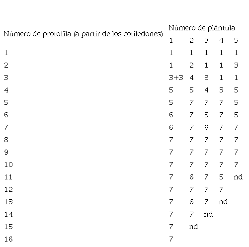 En las plántulas evaluadas, se encontraron protofilas con uno, dos, tres, cuatro, cinco, seis y siete lóbulos cada una (figuras 1, 2, 3, 4,5, 6, 7, 8, 9 y10). Durante el proceso de crecimiento y desarrollo de cada plántula, se encontraron protofilas con diferente número de lóbulos, hasta que dicho número se estandarizó en siete lóbulos en las plántulas evaluadas (cuadro 1). En las cinco plántulas, la primera protofila mostró un solo lóbulo; además, en cuatro de las cinco plántulas se encontró más de una protofila con un solo lóbulo (por ejemplo, figura 8). El número de lóbulos de las protofilas fue aumentando conforme la plántula crece, hasta alcanzar los siete lóbulos. El número de protofilas que tuvo menos de siete lóbulos estuvo entre cuatro y siete en cada plántula, y luego de esto las siguientes protofilas mostraron siempre siete lóbulos. Por lo tanto, en este caso la heteroblastia se considera como un proceso de transición durante la etapa de desarrollo de la plántula, y no como respuesta a las condiciones ambientales.