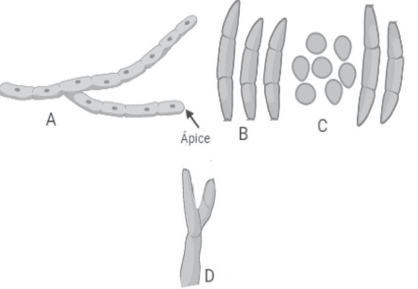 Figura 1. Características microscópicas de Fusarium oxysporum. (A) ápice de la hifa. (B) macroconidias. (C) microconidias. (D) monofialides.