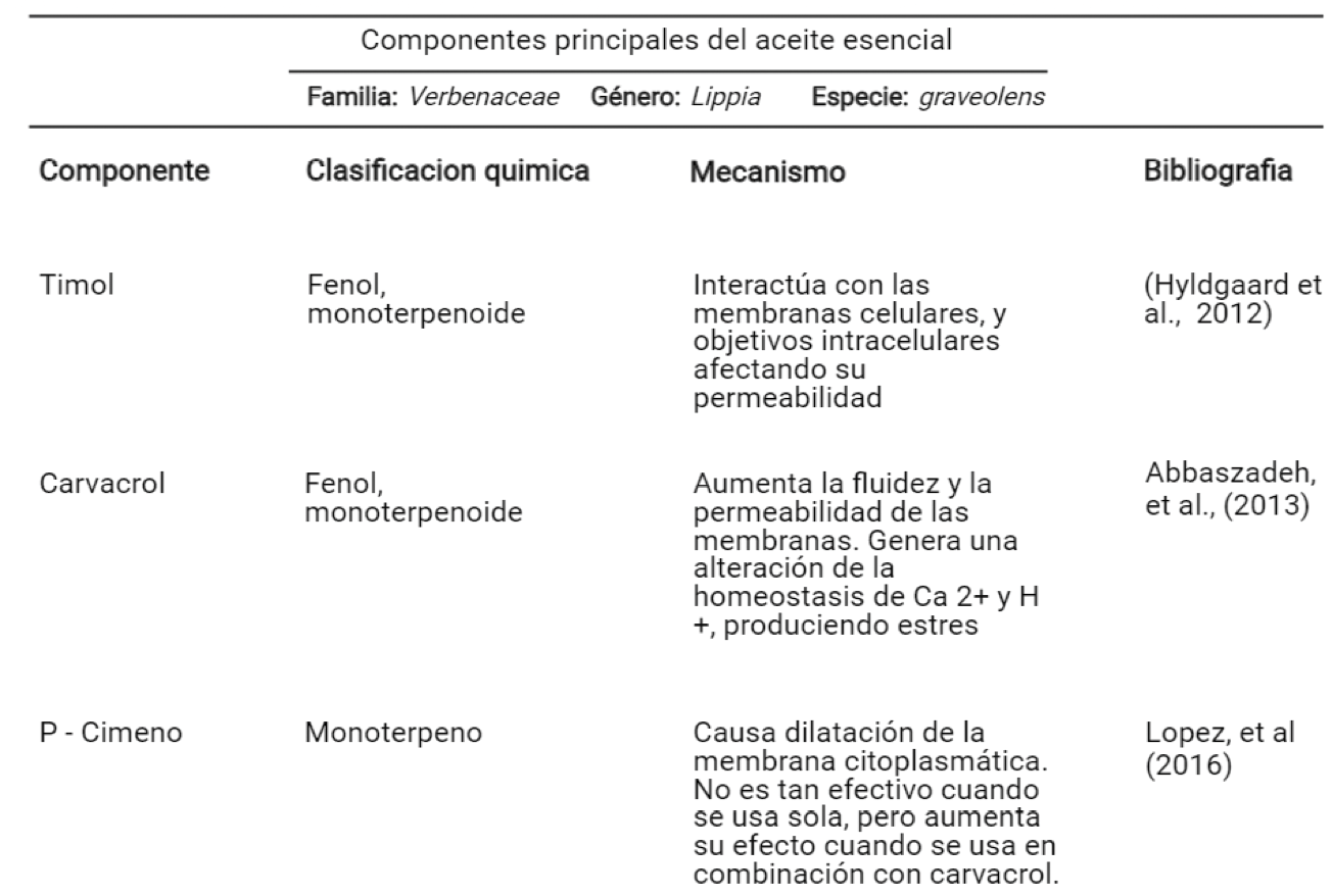 Carvacrol: Monoterpenoide fenólico, componente principal del aceite de Lippia graveolens, pues con concentraciones mínimas (0.05 g/L), se eliminan gran variedad de microorganismos, su mecanismo de acción radica en la capacidad de ubicarse en la membrana, provocando un aumento de la permeabilidad y fluidez, lo que se traduce en un grave deterioro de la misma[30].