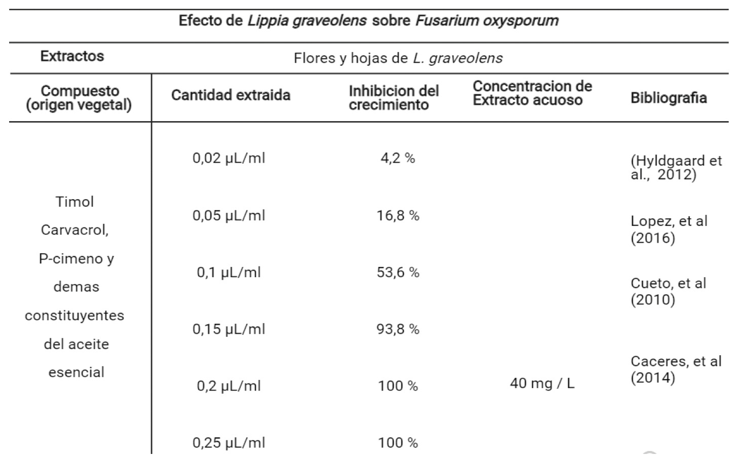 La combinación de estos compuestos alcohólicos en una misma planta, permite comprender que el aceite esencial de Lippia graveolens, logra combatir y eliminar la acción del hongo filamentoso Fusarium oxysporum, pero ¿cuál es la cantidad mínima requerida para que se logre un efecto adecuado de inhibición?, varias investigaciones han tratado de solucionar esta pregunta, cómo es la desarrollada por (Cueto, 2010) [39] en la que se extrajo el aceite esencial utilizando destilación al vapor durante 3 horas, y se prepararon diferentes concentraciones (0.02, 0.05, 0.1, 0.15, 0.20 y 0.25 µl/ml ) utilizando Tween 20 esteril 0,5% (v/v), para posteriormente impregnar una caja de petri y evaluar su acción al colocar un disco de agar que contenía el micelio de Fusarium oxysporum, se procedió a incubar durante 7 días a 28°C y se observó que en todas las concentraciones hubo efectos antifúngicos, pero la inhibición total se logró a una concentración de 0.20 y 0.25 µl/ml (cuadro 2). En otro [38] se utilizó la segunda fase de la extracción del aceite esencial en la que se recurre a la obtención del extracto acuoso o también llamada agua floral, por medio del contacto de la planta con agua en ebullición, este procedimiento ha sido investigado y se ha comprobado de igual medida su actividad biológica; por lo que en el estudio se obtuvieron tres extractos acuosos de diferentes plantas correspondientes a, clavo (Eugenia caryophyllata), canela (Cinnamomum zeylanicum) y orégano mexicano (Lippia berlandieri) obtenidos mediante la técnica de hidrodestilación, contra diferentes hongos incluyendo el de Fusarium oxysporum, de este se concluye que el que mejor logró inhibición para los 6 hongos estudiados fue el extracto acuoso de Lippia graveolens con una concentración de 40 mg/L [38]. Demostrando así que los constituyentes del aceite esencial de Lippia graveolens representan una gran actividad biocida con pocas concentraciones y con métodos fáciles de extracción, mejorando así tanto la calidad de la planta que es afectada por el hongo, como la parte económica de quien la cultive para posterior comercialización de sus frutos.