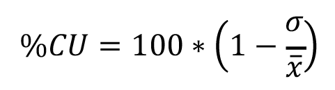 (ecuación 1)Donde, %CU es el porcentaje de uniformidad de la prueba realizada, σ es la desviación estándar de los datos y