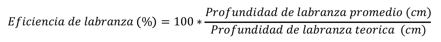 La eficiencia de labranza, se calculó a partir del porcentaje que representa la profundidad promedio lograda en el campo con relación a la profundidad teórica a la que trabaja cada implemento según el fabricante. Para obtenerla se utilizó la ecuación 4.