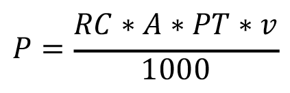 (ecuación 5)Donde P es la potencia requerida para romper el suelo después del pase del implemento (kW), RC es la resistencia al corte (Pa), A es el ancho de trabajo del implemento de labranza (m), PT es la profundidad de trabajo teórica del implemento (m) y v es la velocidad de avance del implemento durante la prueba (m/s).