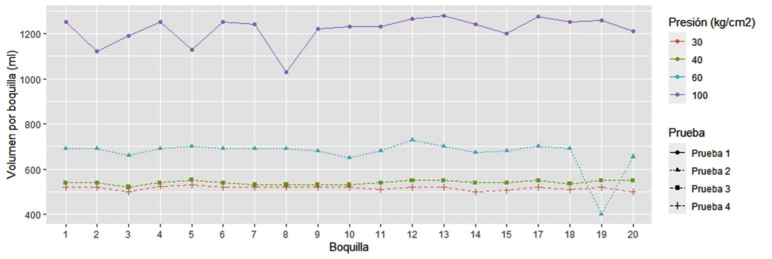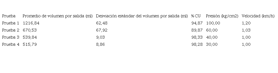 En el cuadro 4 se muestran los resultados de las mediciones de las salidas de las boquillas de pulverizadora en estudio. Desde el inicio de las pruebas se descartó la medición de la boquilla en la posición 16 de izquierda a derecha del implemento, debido a que fugaba excesivamente el líquido, lo cual demuestra que hacer las pruebas brinda la ventaja de detectar posibles puntos críticos antes de la operación en el campo. Los mejores coeficientes de uniformidad se presentan a las menores presiones de operación de la bomba, por lo que para este caso se recomendaría hacer las dosificaciones que correspondan para los volúmenes de aplicación cuando el equipo opere a 30 o 40 kg/cm2 para garantizar una aplicación homogénea al cultivo respectivo.