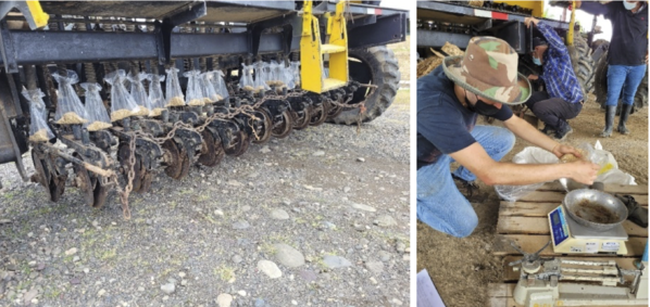 Figura 4. Medición de la cantidad de semilla por cada chorro de la sembradora en estudio.