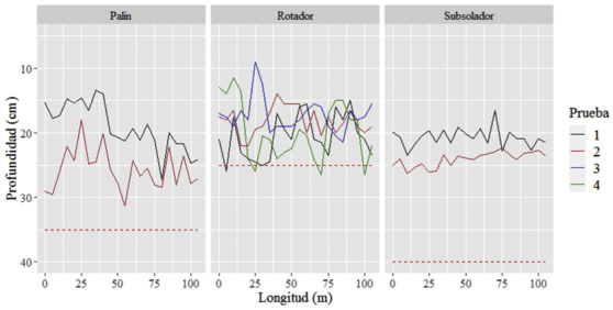 En la figura 6, se observa gráficamente los límites de profundidad teórica de los implementos (línea roja punteada). Las mejores eficiencias de la labranza se alcanzaron con el arado rotativo, pues fueron las profundidades más cercanas a las profundidades teóricas de los implementos según los fabricantes. Las pruebas corresponden a las indicadas en el cuadro 2.