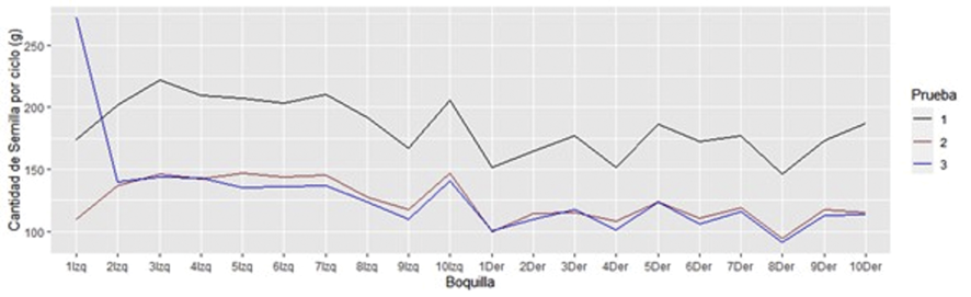 Figura 7. Cantidad de semilla para las salidas de cada contenedor de la sembradora en estudio