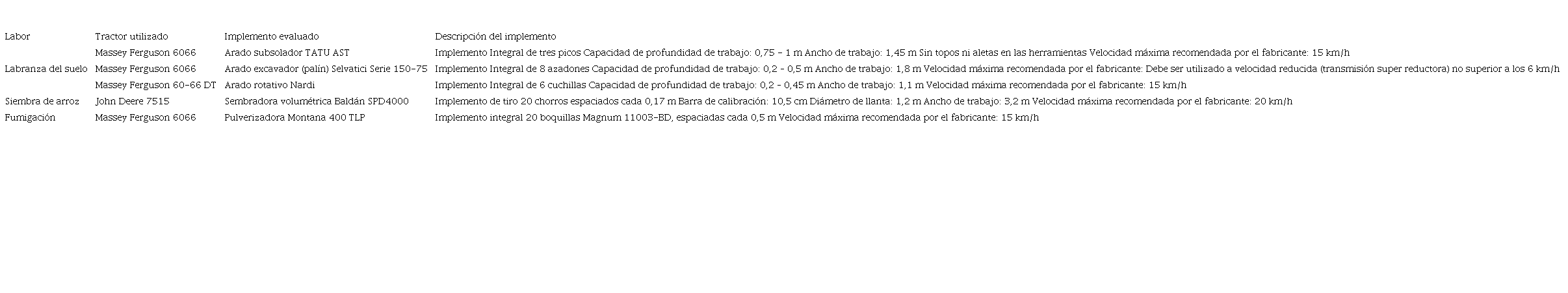 Se determinaron los coeficientes de uniformidad de trabajo de los siguientes implementos; arado subsolador, arado excavador (palín), arado rotativo, sembradora volumétrica y pulverizadora integral. Las pruebas de uniformidad de profundidad de labranza del suelo (arado subsolador, arado excavador, arado rotativo) y pulverización se establecieron en el campo de prácticas de la Escuela de Ingeniería Agrícola del Instituto Tecnológico de Costa Rica, donde las condiciones del suelo fueron las mismas para las labores de labranza, con una pendiente del 6%, suelo de textura Arcillosa y contenido de humedad de 34%, cercano al punto friable del terreno. Las pruebas de uniformidad en sembradora volumétrica se realizaron en una empresa productora de arroz colaboradora de la institución, ubicada en el Pacífico Central de Costa Rica. Las pruebas realizadas con la pulverizadora y la sembradora se hicieron en superficies planas, homogéneas y cementadas.