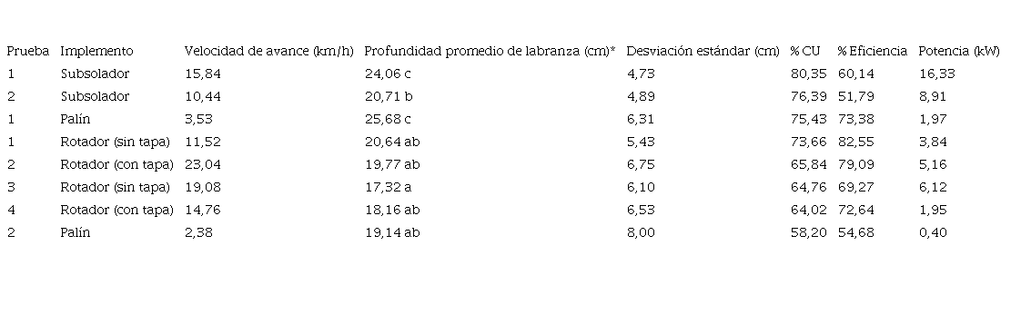 En la figura 6 y el cuadro 2, se muestran los resultados de las mediciones inmediatamente después de aplicar los implementos en el suelo. La labor del subsolado obtuvo el único coeficiente de uniformidad aceptable de profundidad de labranza entre los implementos estudiados, a una velocidad de avance promedio de 15,84 km/h. Debido a que el terreno para todas las pruebas fue el mismo y se utilizó el mismo tractor, se considera que, si es posible lograr coeficientes de uniformidad altos variando la velocidad de avance de los equipos, y considerando el patinaje durante la operación. Para el palín, las profundidades fueron significativamente diferentes con un aumento del 17,23% de la uniformidad cuando se aumentó la velocidad de avance, dentro del rango permitido por el fabricante. Cuando la velocidad fue menor, no hubo diferencia con el arado rotador, independientemente del uso o no de la tapa de este implemento en ninguna de las velocidades de avance probadas. Los coeficientes de uniformidad mayores corresponden a implementos de labranza vertical primaria, sin embargo, son los implementos que, al no desestructurar el suelo, requieren de mayor potencia para los tratamientos de labranza secundaria.