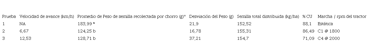 La sembradora no tiene diferencias significativas de cantidad de semilla distribuida por cada chorro, sin embargo, a mayores velocidades disminuyó la uniformidad de las salidas de la semilla. Se recomienda verificar en el campo otras velocidades de avance que mantengan la uniformidad en la salida de las semillas en cada chorro y capacitar a quienes operen los equipos para que mantengan velocidades adecuadas para la labor.