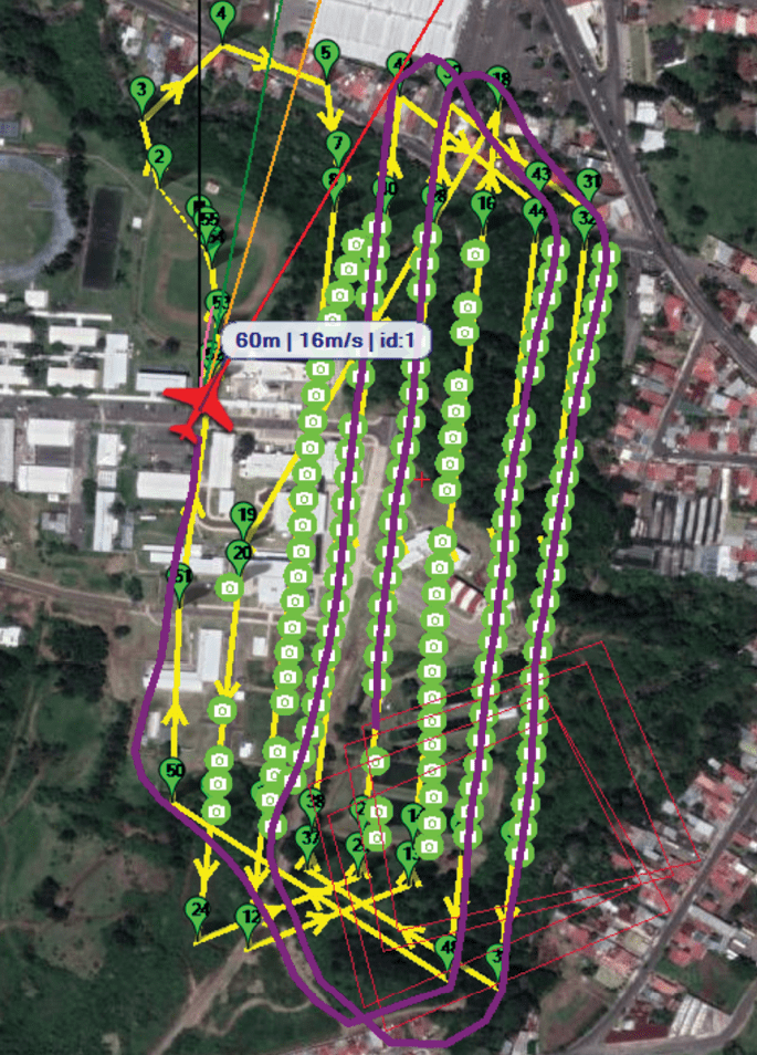 A continuación, se muestran los resultados de una de las misiones autónomas. En esta misión se cubrió un área aproximada de 30 hectáreas de terreno, que corresponden al sector este del campus tecnológico central del ITCR en Cartago con una duración aproximada de nueve minutos y medio, con un consumo de un 40% de una batería LiPo 6S de 8000 mAh. El plan de vuelo se describe en la Figura 5, que consistió en un sobrevuelo a 100 metros de altitud, con una separación entre líneas de 40 metros y un traslape vertical y horizontal del 80%. Se aplicó el salto de dos líneas como forma de vuelo para conformar la ruta, con el fin de tener suficiente flexibilidad espacial para realizar virajes más amplios y de esta forma no exigir a la plataforma realizar virajes muy abruptos, los cuales pueden ser peligroso por la inestabilidad inducida. Con este acercamiento se logra conservar la separación de líneas fijada sin mayores problemas.