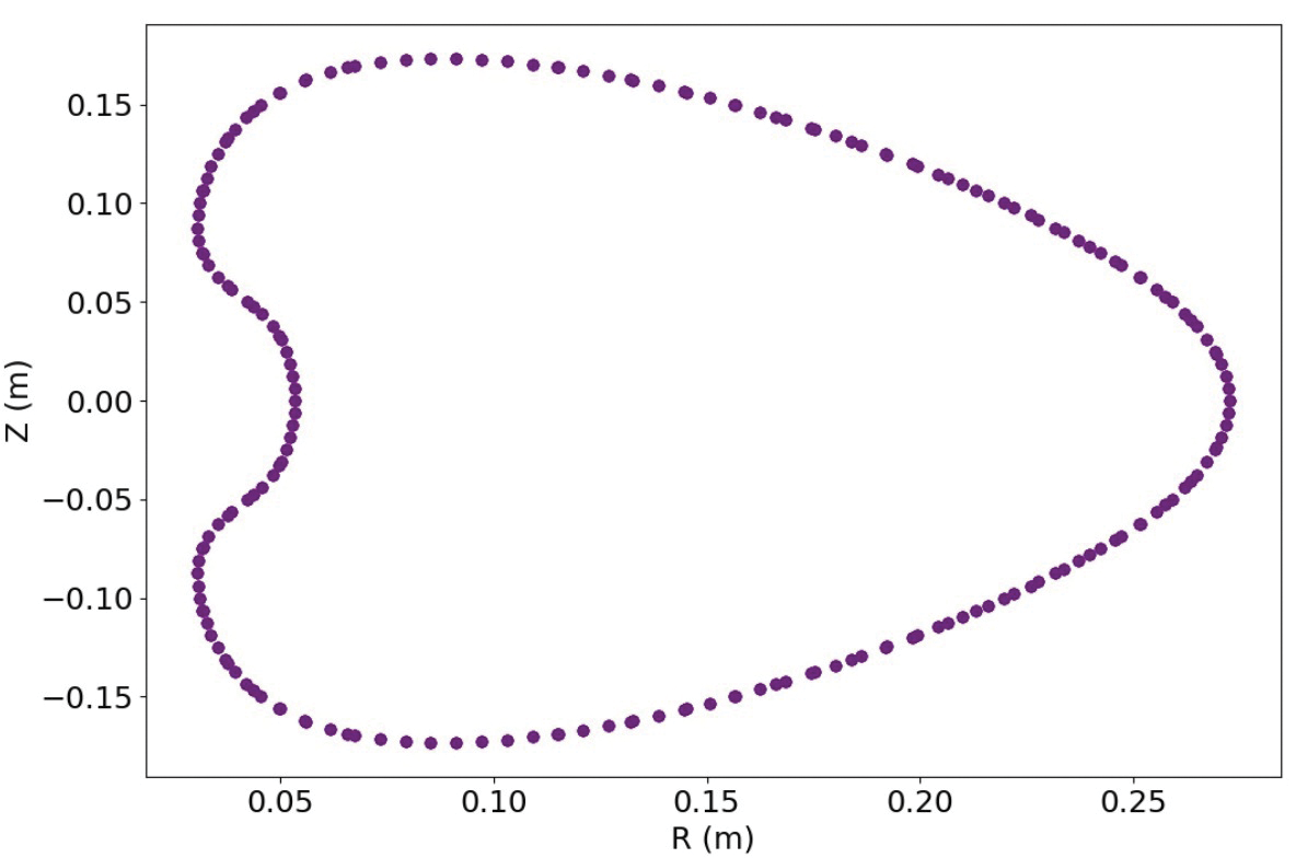 ( 4 )El código DESCUR se utilizó para calcular los coeficientes de una serie de armónicos de Fourier, obtenidos a partir de las coordenadas de la última superficie de flujo magnético de MEDUSA-CR. La figura 1 presenta las coordenadas radial y vertical obtenidas de esta última superficie.