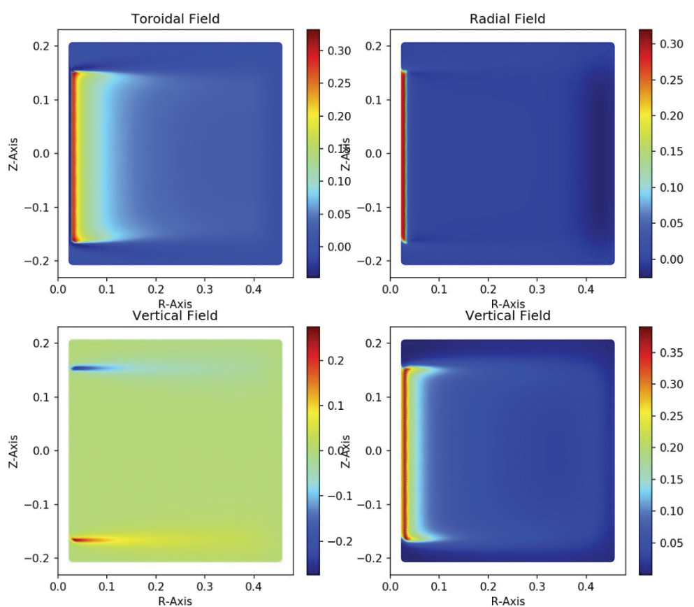 Figura 2. Campo magnético de MEDUSA-CR producido únicamente por las bobinas toroidales. La barra muestra el valor de campo magnético en unidades de Tesla.