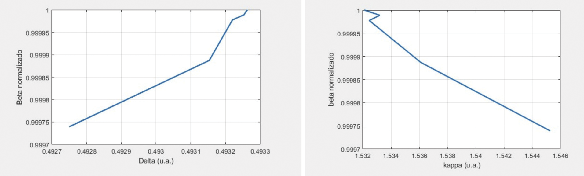 Los parámetros de elongación y triangularidad se obtienen de la última superficie magnética cerrada LCFS (Last Closed Flux Surface) ó “separatrix”. El cambio del parámetro beta según la variación de la triangularidad y elongación se muestra en la figura 4.