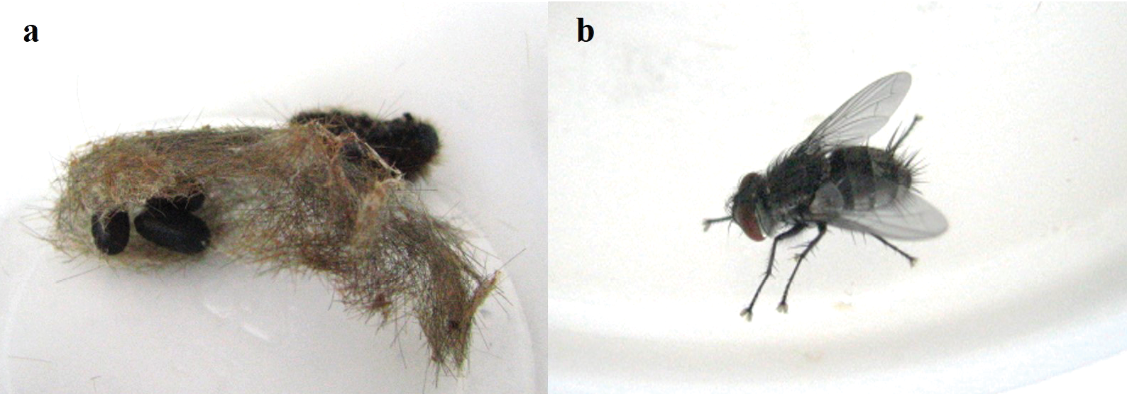 Figura 4. Carcelia sp. como parasitoide de E. albida. a- Pupas obtenidas de larvas parasitadas. b- Adulto