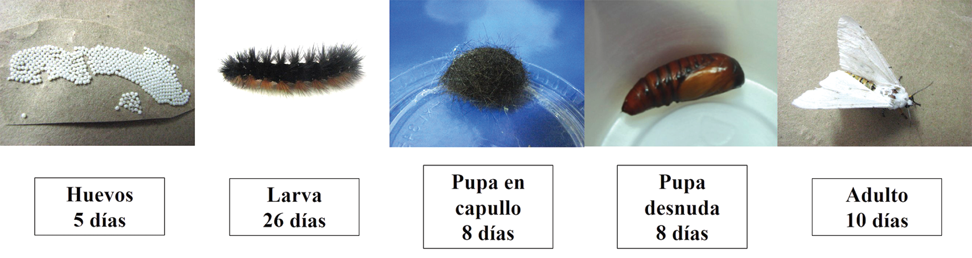 El lepidóptero fue identificado como Estigmene albida, una polilla de la superfamilia Noctuidae, familia Erebidae. El ciclo de vida de E. albida se estableció en 57 días totales bajo condiciones controladas de laboratorio (Figura 1). Para E. acrea se ha establecido que el ciclo de vida dura, en promedio, entre 35 a 42 días en condiciones ambientales [17], por lo que E. albida presenta un ciclo de vida 15 días mayor en condiciones controladas de laboratorio que el reportado para E. acrea, sin embargo, el mismo autor también reporta que en estado larval puede llegar a durar hasta 45 días, razón por la cual, se estima que el rango del ciclo de vida puede ser ampliado, dependiendo de las condiciones ambientales y del régimen de alimentación en el que se encuentren los insectos.