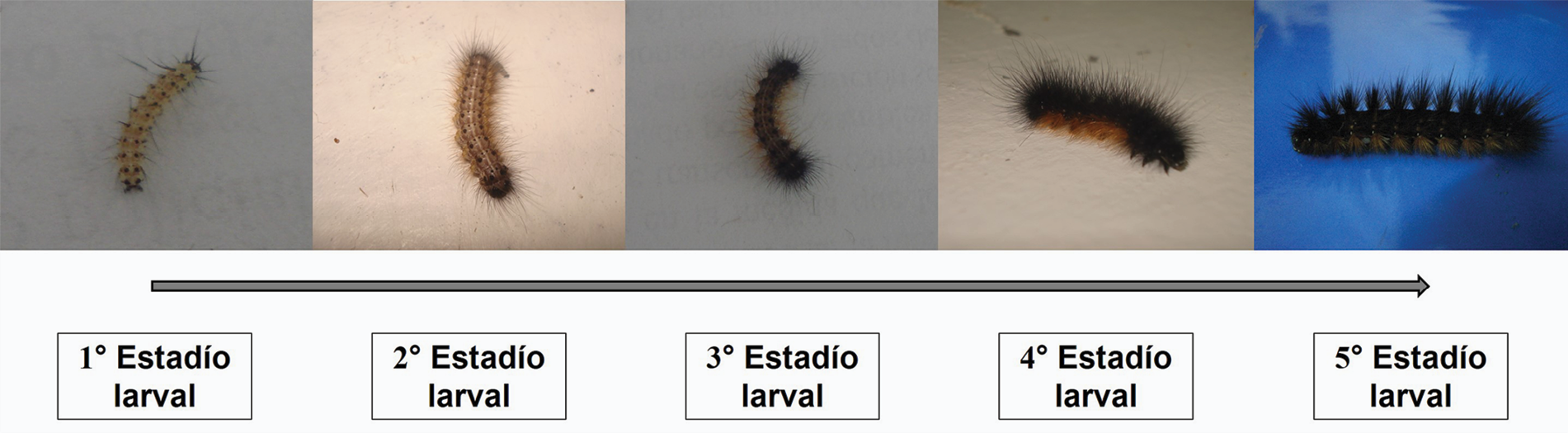 E. albida presentó 5 estadíos larvales (figura 2). El primer estadío se caracterizó por larvas de color amarillo pálido, con pelos corporales finos de color negro. Al iniciar el segundo estadío larval, las larvas aumentaron la cantidad de pelos corporales y estos variaban de color marrón, café y negro, además presentaron una franja longitudinal de color amarillo o blanco. El tercer instar se caracterizó por un oscurecimiento de la larva y de los pelos corporales, evidenciándose todavía la franja longitudinal. Para el cuarto estadío larval, los pelos corporales son de color negro en la parte superior y marrón en la parte inferior, manteniendo este mismo patrón en el quinto estadío, solo que la larva es predominantemente negra y de mayor tamaño, durando 26 días en total en la fase larval. En general, en todos los estadíos, la larva se alimentaba vorazmente del alimento artificial, aumentando su consumo conforme incrementaba de tamaño.