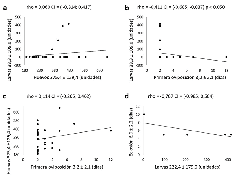Figura 3. Matriz de correlación lineal de Spearman, Intervalo del 95 % de confianza para el coeficiente rho y significancia de la prueba (α = 0,050). Hembras en reproducción sexual. a, b, c. Relación para parejas que presentaron oviposición (n=29). d. Relación para larvas eclosionadas (n=5).