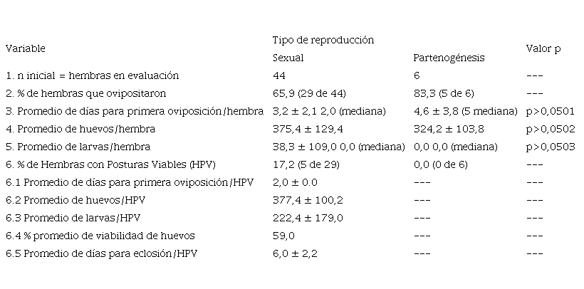 En cuanto al promedio de larvas por hembra (variable 5) registrado solo para la reproducción sexual, su valor alcanzó 38,3 individuos pero presentó una variación importante de ± 109,0 individuos, lo cual provocó que no existiera diferencia significativa (p > 0,050) al comparar esta serie de datos con 0,0 de eclosión de larvas provenientes de hembras partenogénicas; sin embargo, esta condición de 0,0 % de huevos viables en las hembras partenogénicas se debe verificar con un estudio posterior utilizando mayor cantidad de individuos para definir la incidencia del fenómeno de partenogénesis en E. albida, ya que este dato no está actualmente disponible en investigaciones previas.