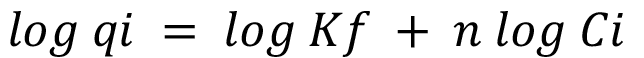 Donde Qi es la masa de Ca adsorbido por unidad de masa de suelo (meq g-1), Ci es el equilibrio de las concentraciones de Ca en solución (meq l-1), Kf constante de equilibrio de adsorción relacionada con la energía de enlace en la superficie y n es una constante cuyo valor depende de los coloides.