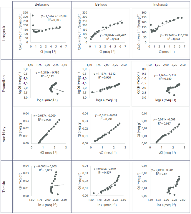 La isoterma de Van Huay es el modelo más adecuado en la predicción del comportamiento del Ca ante su agregado con fertilizantes en los suelos de Belgrano, Inchausti y Bellocq. La isoterma de Freundlich es pertinente para ser utilizada solamente en el suelo de Bellocq, aunque con menores coeficientes de ajustes. Finalmente, las isotermas de Langmuir y Tempkin no son recomendables para el estudio de Ca en los suelos estudiados.