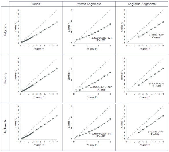 Las funciones de dosificación mostraron que no puede ajustarse la totalidad de las concentraciones estudiadas a una ecuación debido a que los resultados no cumplen los supuestos de normalización de residuos. Se observó que subestiman los valores en las concentraciones más bajas, se sobrestiman los valores en las partes medias y se vuelven a subestimar en las partes altas (Figura 3). Ante este comportamiento se observó que se puede dividir el patrón en dos segmentos con comportamiento diferencial en los tres suelos. El primer segmento se corresponde con los tratamientos de 0,25 a 3 meq l-1 que puede ajustarse con ecuaciones polinómicas de segundo grado, mientras que el segundo segmento corresponde a los tratamientos de 3 a 9 meq l-1 que puede ajustarse con ecuaciones lineales.